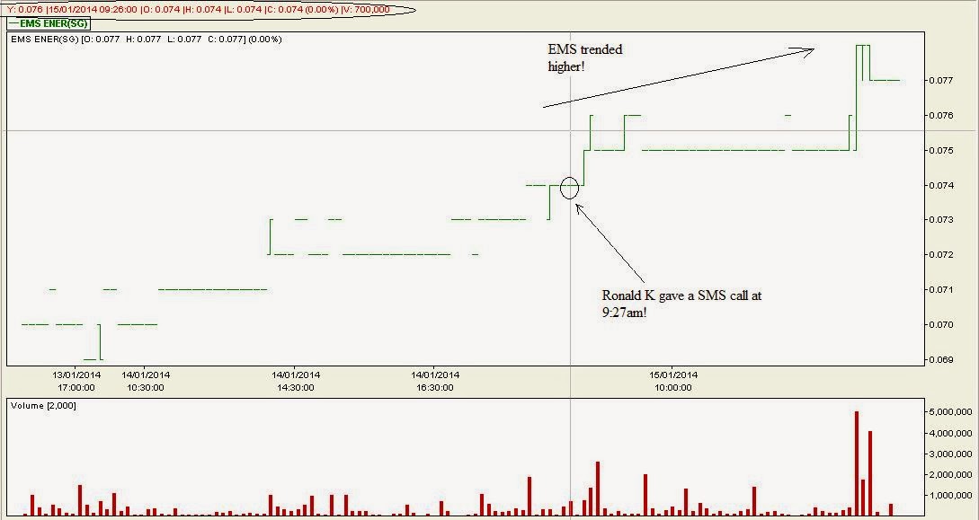 So last night I blogged about the SMS Service. Today, my PAs gave a call again on EMS and yes indeed the stock trended higher!! It's amazing because of the consistent calls were we providing. The call was given on 9:27am and as of now it moved up 2-3 pips! We shall continue to monitor.